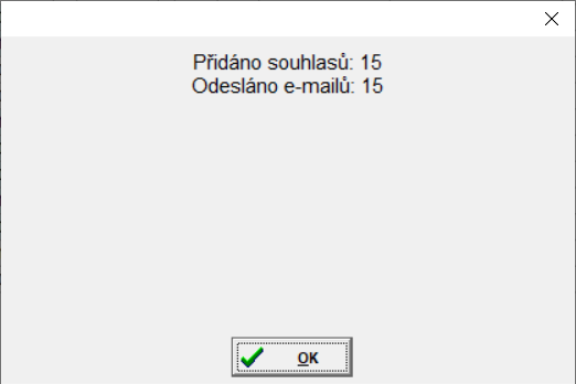 - Po skončení akce program oznámí počet vložených souhlasů, při zapnutém parametru i počet odeslaných mailů.