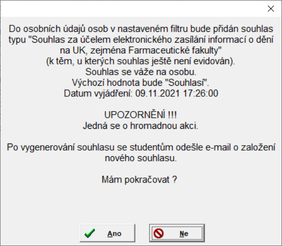 - Po výběru typu souhlasu se program zeptá, zda má akci opravdu provést. V dotazu také zrekapituluje údaje souhlasu (typ souhlasu, který bude vkládat, výchozí hodnotu souhlasu, datum vyjádření a váže-li se souhlas na osobu nebo studium).