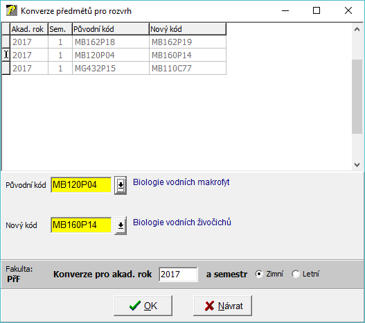 - Každý záznam smí být pořízen pouze 1x (jedinečnost dle "fakulta", "akad. rok", "semestr", "původní kód", "nový kód").