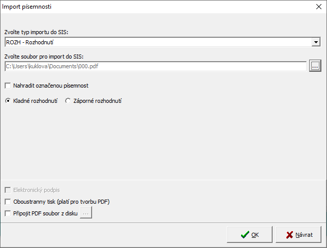 2. Při importu jedné písemnosti pomocí tlačítka "Nahrát soubor" na záložce "Odchozí dokumenty" je pro písemnost "ROZH - Rozhodnutí" do dialogového okna pro import přidán přepínač jestli se jedná o Kladné rozhodnutí nebo Záporné rozhodnutí.