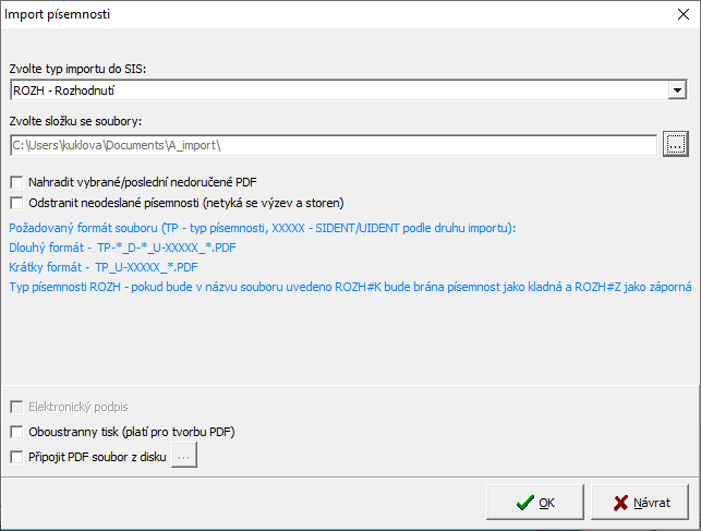 3. Při hromadném importu rozhodnutí ze složky (import dle masky souboru) je nově třeba za typ písemnosti doplnit písmeno "K" pro kladné/"Z" pro záporné rozhodnutí.