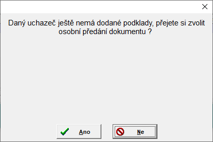 - po jeho použití se zobrazí hláška "Daný uchazeč ještě nemá dodané podklady, přejete si zvolit osobní předání dokumentu?" s volbou "Ano"/"Ne". Jiná volba než osobním předáním není možná!