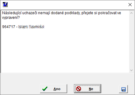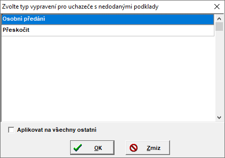 - při volbě "ano" program začne jednotlivá ROZH vypravovat a pokud program narazí na uchazeče, který má kladný VPR, ale nedodal podklady či řádně nedoložil předchozí vzdělání, je na tuto skutečnost uživatel upozorněn a může buď rozhodnutí přeskočit nebo zvolit osobní předání tohoto konkrétního rozhodnutí, nebo u všech uchazečů (zaškrtnutím checkboxu "Aplikovat na všechny ostatní"), kteří nedodali podklady/nedoložili vzdělání.