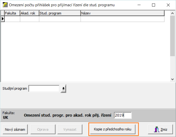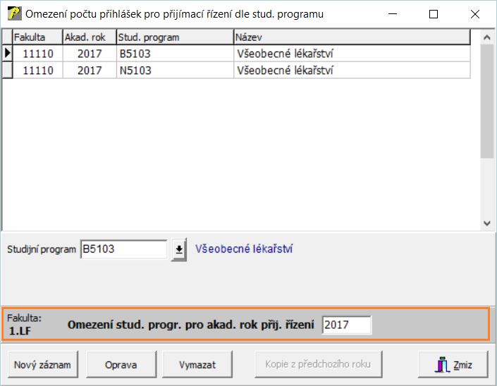 - Po nastaveni roku se zobrazí seznam nastavených omezení (studijních programů). Zobrazují se data fakulty, za kterou uživatel pracuje.