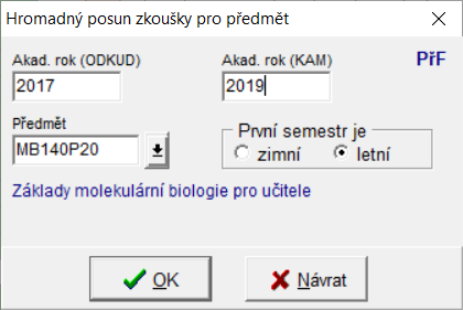 Akce se vyvolá v nabídce horního menu "Zkoušky" volba "Hromadný posun zkoušky pro předmět". Po jejím zvolení se otevře stejnojmenné okno.
