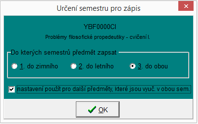 - Pokud se zapamatování semestru nezvolíte, program se bude ptát při každém dalším takovém předmětu.