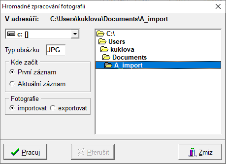 Tlačítkem Pracuj se spustí načítání fotek ze souborů, tlačítkem Přeruš pak lze práci zastavit a tlačítkem Zmiz se celé okno zavře.