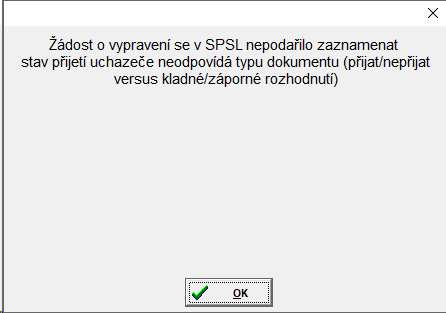 - v případě, že typ rozhodnutí neodpovídá stavu přijetí, písemnost nebude vypravena, zobrazí se uživateli informace: