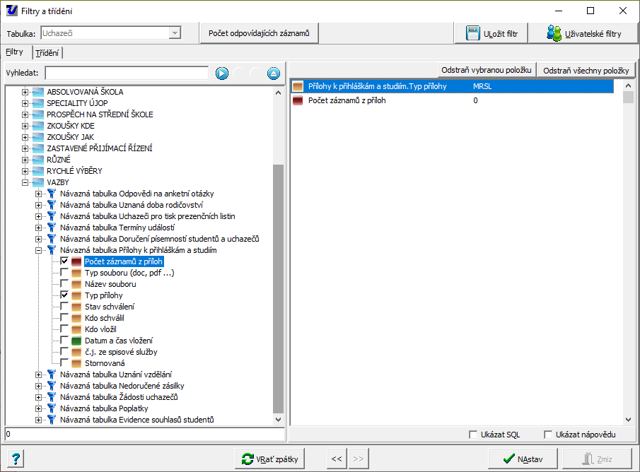 - rozbalte "větev" VAZBY, návazná tabulka Přílohy k přihláškám a studiím