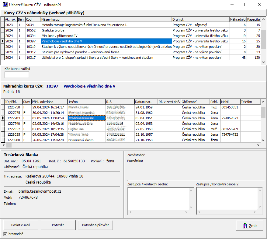 - Pro potvrzení a převod dalších náhradníků je třeba opět otevřít okno "Uchazeči kurzu CŽV - náhradníci".