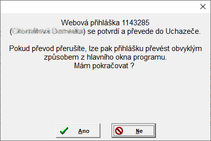 - Pokud uživatel převod přihlášky přeruší, lze přihlášku znovu převést obvyklým způsobem (horní menu "Uchazeč" ---> "Nová přihláška z webu" nebo odpovídající tlačítko s obrázkem kočárku a písmenem "W").