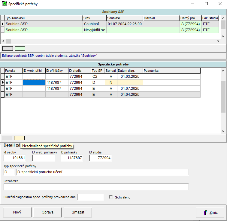 - ID studia - pokud je vyplněno jen ID studia a nevyplněno ID přihlášky, specifickou potřebu zaevidovala referentka v programu Student
