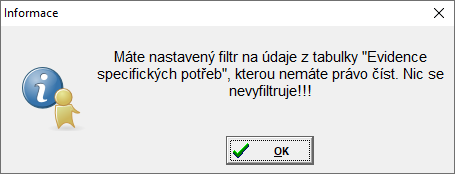 - v případě, že si uživatel pracující v roli, která nemá právo "Specifické potřeby" alespoň pro čtení, nastaví filtr na položku návazné tabulky "Evidence specifických potřeb", program na tuto skutečnost upozorní hláškou: