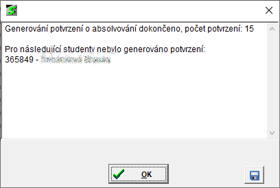 Na konci generování se zobrazí hláška s počtem vygenerovaných potvrzení a seznamem studií, kterým nebylo potvrzení vygenerováno.