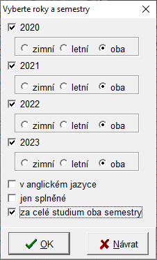 Zobrazené roky se vygenerují podle prvního studia ve filtru, proto je vhodné mít ve filtru studia za stejná období.