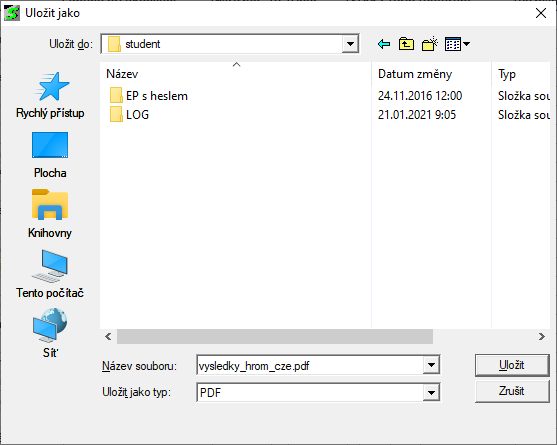 - Jako výchozí název souboru a na základě zvoleného jazyka tisku program přednastaví "vysledky_hrom_cze.pdf" nebo "vysledky_hrom_eng.pdf".