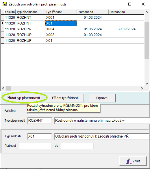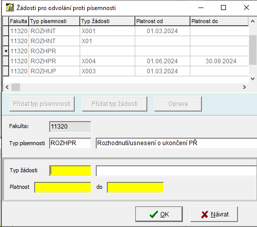 * Při vkládání nových záznamů (ručním zadáním kódu) se kontroluje existence kódu v číselníku, možnost použít pro odvolání, jedinečnost záznamu pro stejnou fakultu, písemnost a žádost.