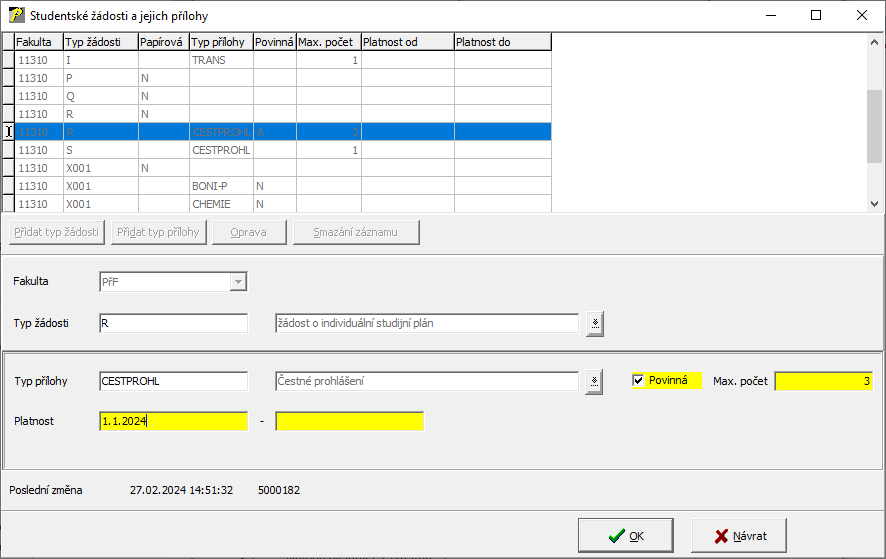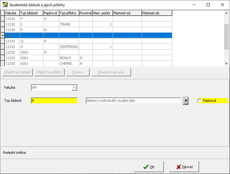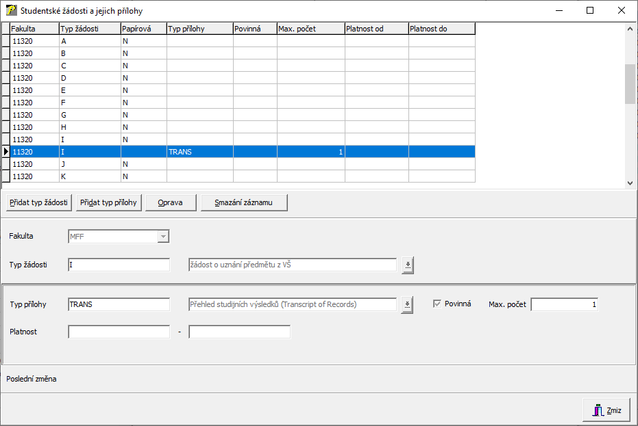 Slouží pro nastavování příloh, které lze použít pro jednotlivý typ žádosti. Po stisku nového tlačítka "Stud. žádosti a jejich přílohy" se otevře okno "Přílohy k žádostem pro přezkum".