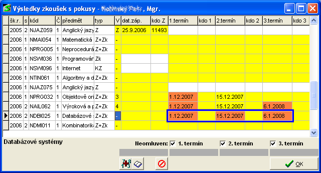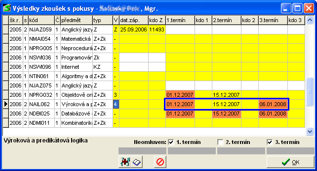 V těchto případech (výsledek zkoušky = "-") musí být všechny termíny Neomluvené.