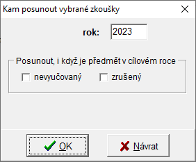 Pokud chce uživatel posunout předmět i v případě, že je ve zvoleném roce předmět nevyučovaný nebo zrušený, je třeba z dialogovém okně pro výběr roku zaškrtnout odpovídající checkbox, zda posouvat i v případě, že v "cílovém" roce je předmět: