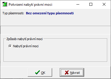 - způsob nabytí právní moci při hromadném potvrzení = "Nabytí právní moci" dle předpokládaného data (dle nastavení v číselníku "Typy písemností" u jednotlivých písemností)