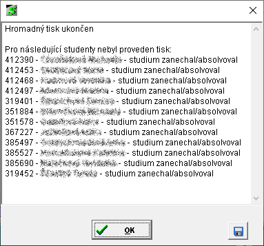 - na konci akce se zobrazí hláška "Hromadný tisk ukončen", případně obsahuje seznam studií / přihlášek, u kterých se tisk nezdařil