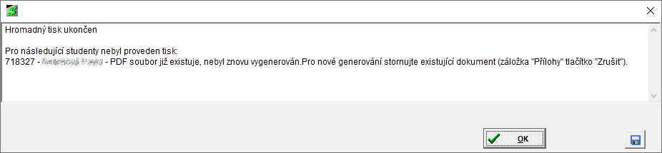 - pokud při tisku ZL program zjistí, že ZL byl již v minulosti vygenerován a je uložen v systému, se na konci celého tisku v chybovém protokolu zobrazí se informace "PDF soubor již existuje, nebyl znovu vygenerován. Pro nové generování stornujte existující dokument (záložka Přílohy, tlačítko "Zrušit"")