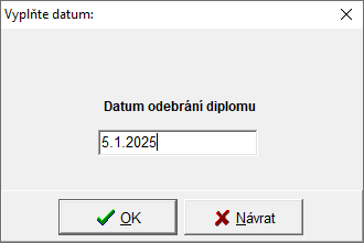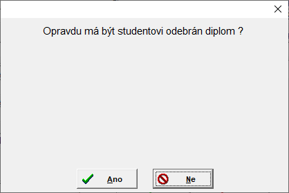 Po stisknutí volby se zobrazí okno, kde uživatel zadá datum odebrání diplomu a následně potvrdí dotaz, zda opravdu má byt studentovi diplom odebrán. V případě kladné odpovědi program datem vyplněným v dialogu naplní položku pro evidenci data odebrání diplomu na záložce "Škola".
