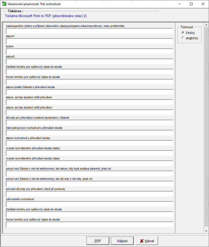 - U žádosti typu "C - žádost o přerušení studia" lze tisknout rozhodnutí dle tiskové šablony č. 11 "ROZPOP - Rozhodnutí o přerušení studia"