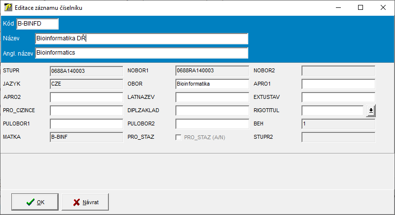 - Položka "MATKA" ("Odpovídající obor PŘ" nebo také "Obor pro převod do Studenta"):