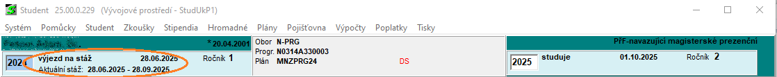 V případě výjezdu na stáž se ve druhé řádce zobrazuje "Aktuální stáž: od - do" (u studentů, kteří mají k dnešnímu dni evidovaný výjezd na stáž (záložka Škola, tlačítko Návrhy na výjezd na stáž (tabulka STAZ2STUD)) a stáž je schválena.