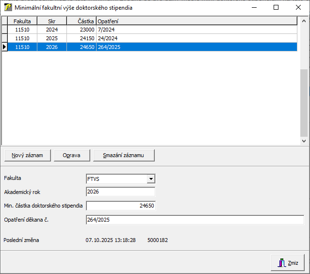 Minimální výše doktorského stipendia fakulty - minimální výše doktorského stipendia pro daný akademický rok stanovený děkanem fakulty.