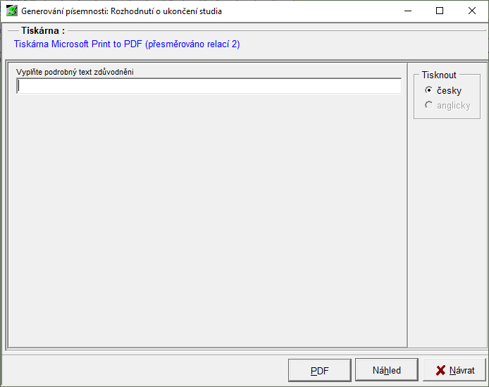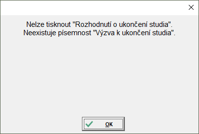 Rozhodnutí se tiskne přes šablonu č. 15 "Rozhodnutí o ukončení studia".