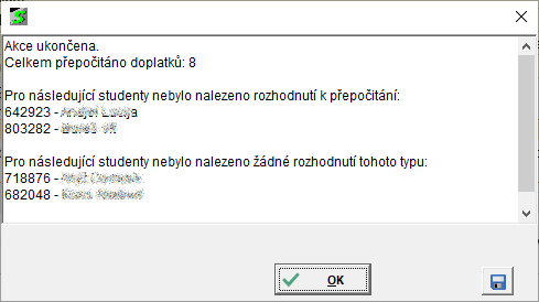 - na konci akce se zobrazí report s počtem přepočítaných doplatků a případným seznamem studií, u kterých přepočet neproběhl (nemají rozhodnutí k přepočítání, nemají schválenou žádost o přiznání doktorského stipendia atd. )