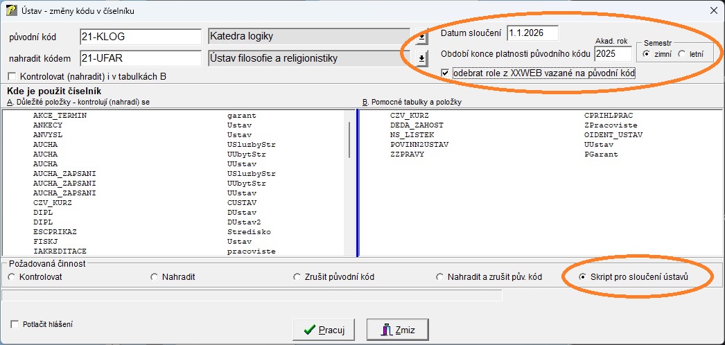 Po výběru volby Skript pro sloučení ústavů v Požadované činnost se zpřístupní pro vyplnění položky v pravém horním rohu potřebné pro vytvoření požadovaných scriptů: