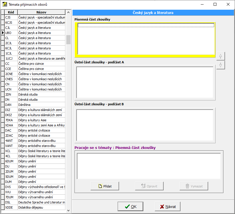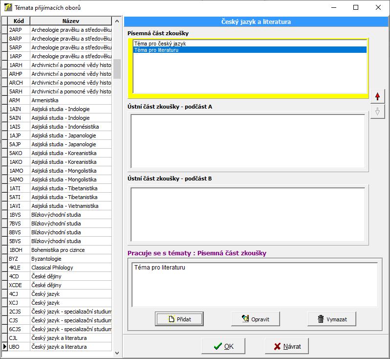 Parametry » Témata přijímacích oborů » Přidání nového tématu