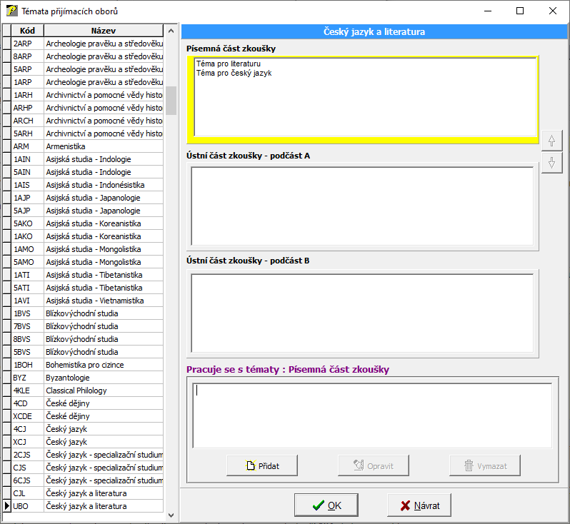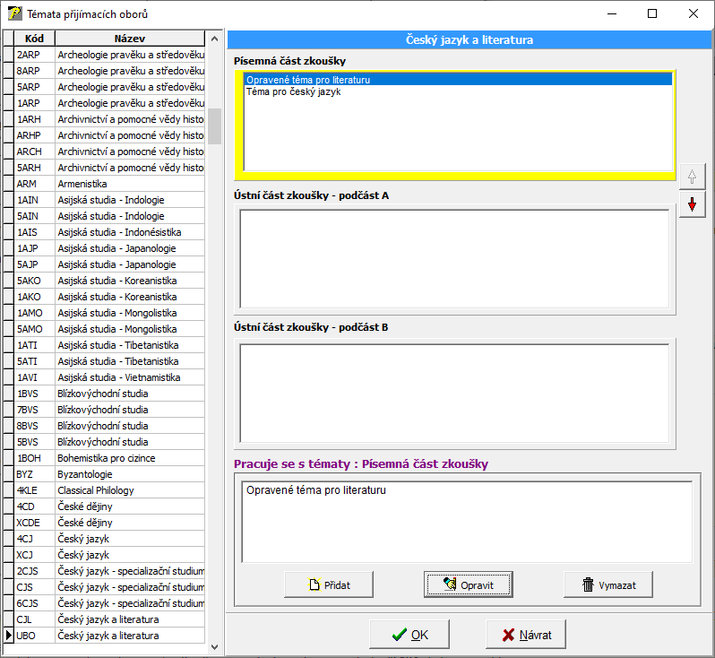 Parametry » Témata přijímacích oborů » Oprava existujícího tématu