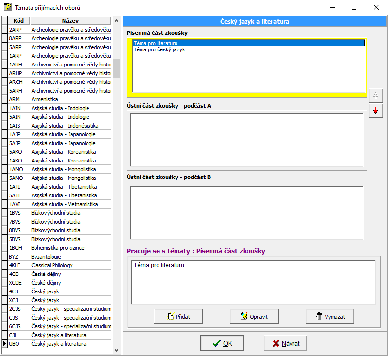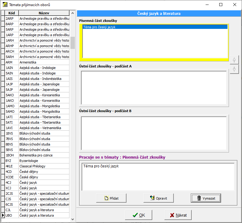Parametry » Témata přijímacích oborů » Vymazání tématu