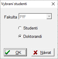 Soubory pro FIS se obvykle vytvářejí zvlášť pro studenty a doktorandy a pro každou fakultu. Po stisknutí tlačítka Soubor pro FIS na kartě Výška stipendií v okně Stipendia se nejprve může objevit okno (zda se toto úvodní okno objevuje, záleží na dohodě s Erudiem), kde lze potvrdit nebo změnit výběr fakulty a typu studia: