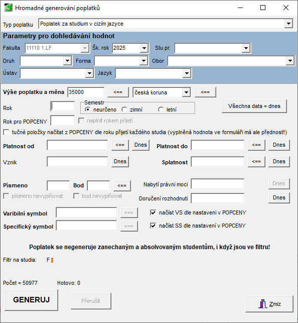 Student - Poplatky za studium » Práce s modulem poplatky » Hromadné generování