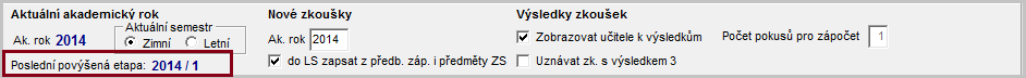 - Pod položkou "Ak. rok" je parametr "Poslední povýšená etapa". Je pouze pro čtení. Prvotní nastavení nastavuje RUK. Dále se automaticky aktualizuje po provedení povýšení etapy ve Studentovi.