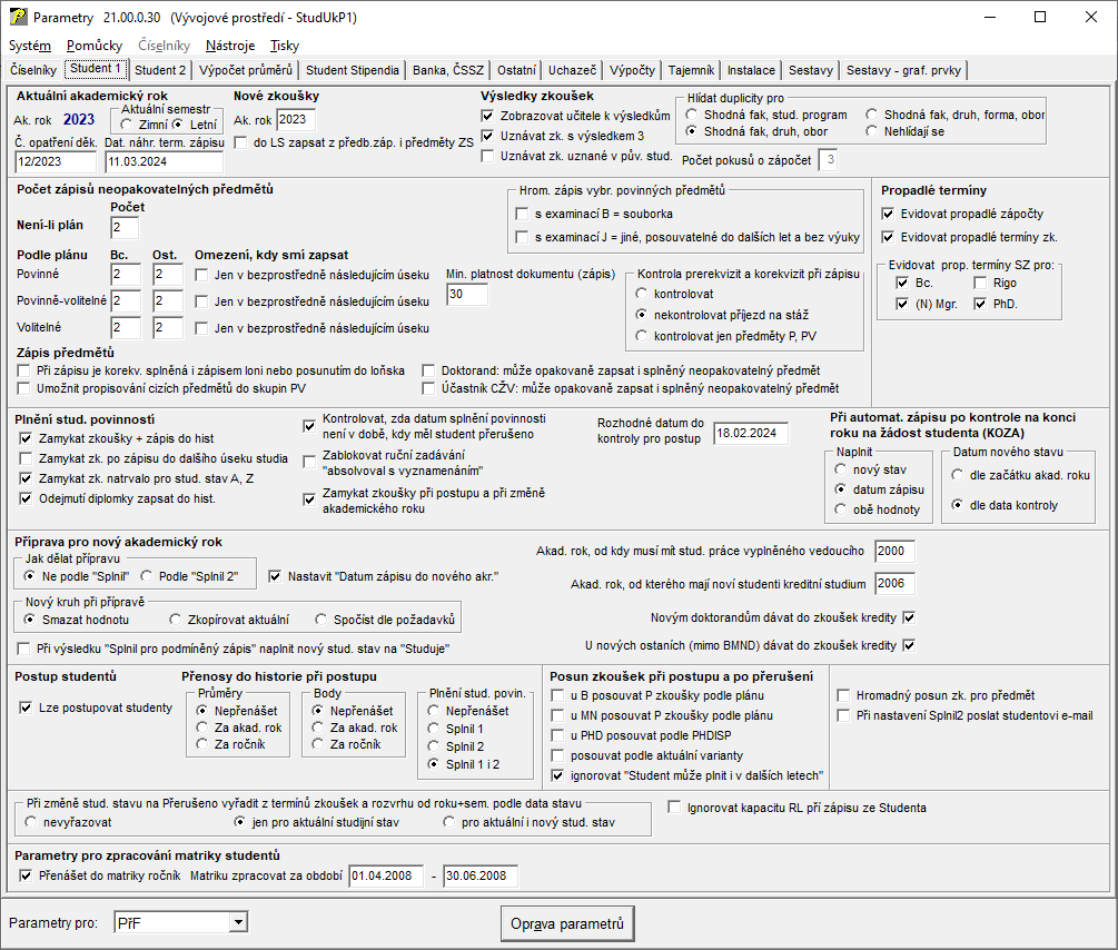 Parametry » Nastavení parametrů systému » Parametry STUDENT 1