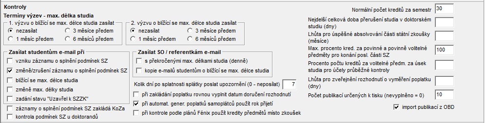 Výchozí nastavení je "zapnuto" (zaškrtnuto). - kontrola podmínek SZ u doktorandů - je-li zaškrtnuto, kontrolují se podmínky SZ u doktorandů - jak přímo ve Studentovi, tak programem Kontrola zápisu - KoZa.
