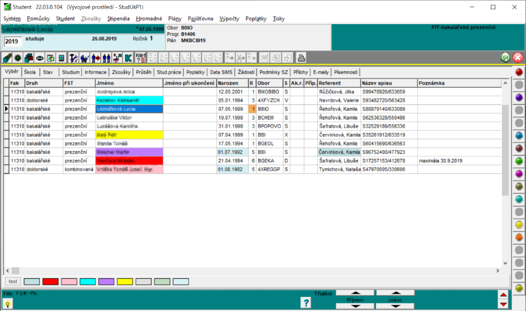 - referent - označení referenta, jemuž je student momentálně přidělen. Na požádání je možné zařídit pro postgraduální studium, aby se v seznamu studentů na stránce Výběr místo referenta zobrazoval školitel (vhodné zejména v případech, kdy jeden referent má na starosti všechny doktorandy).