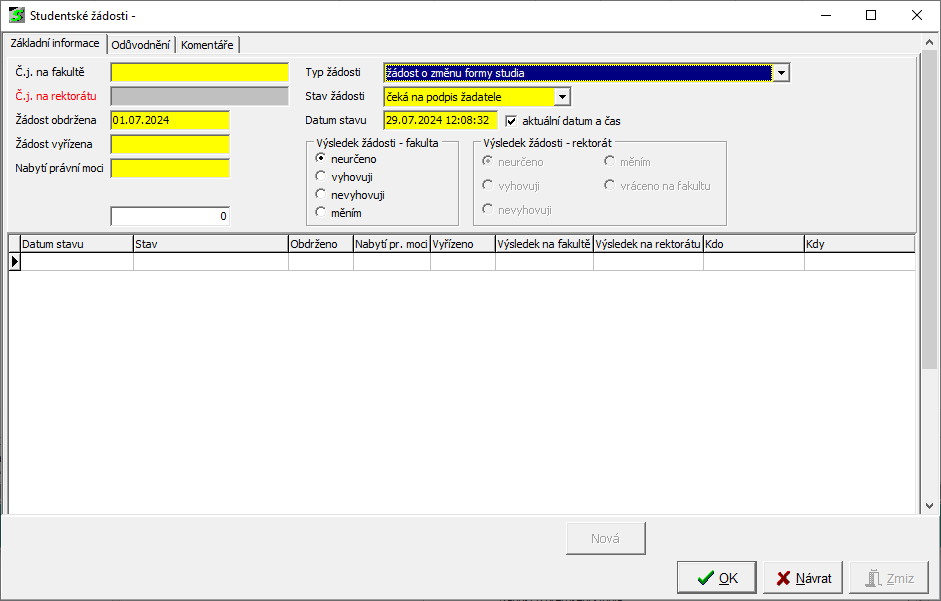 - Výsledek žádosti - rektorát má hodnotu Vyhovuji a Stav žádosti je Schváleno rektorátem