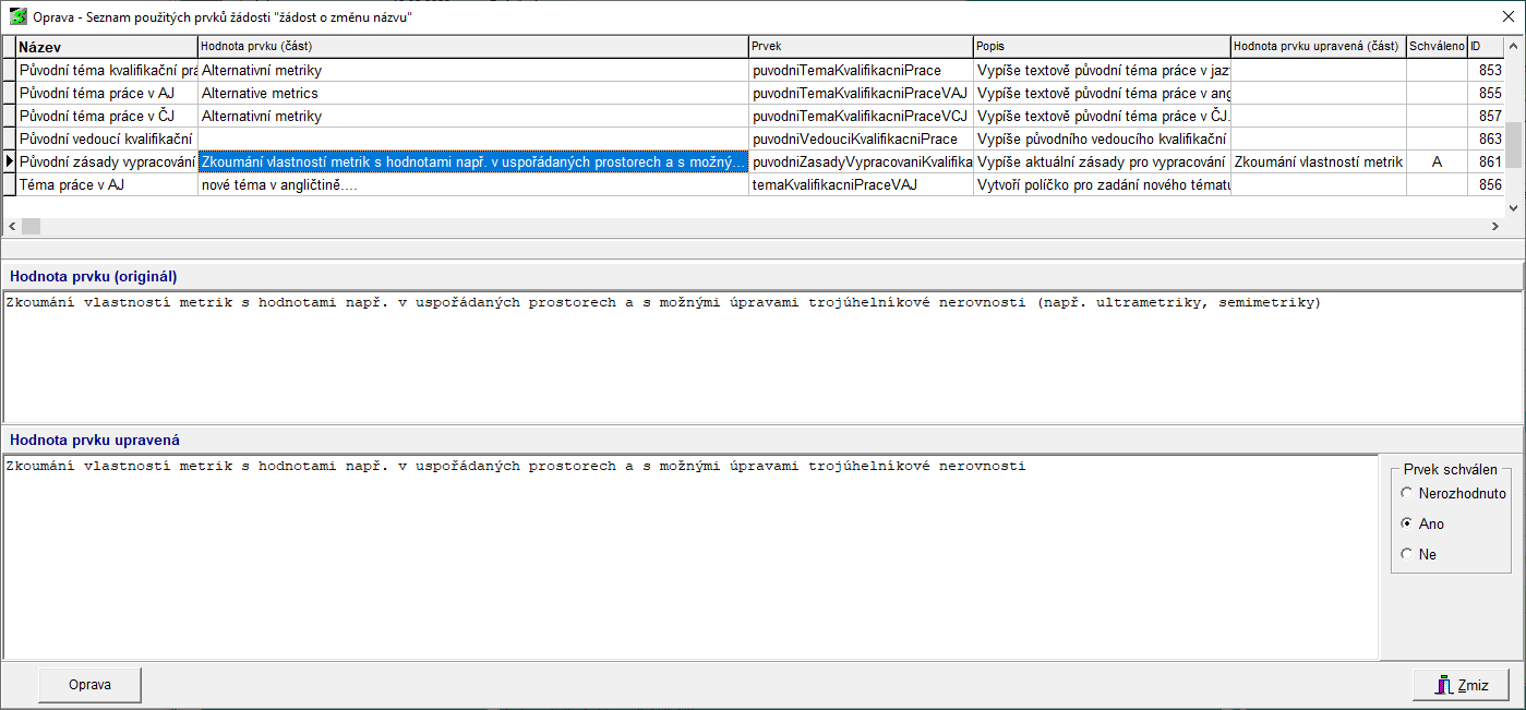 Žádosti jsou zpracovávány a vyřizovány na úrovni fakulty, případně předávány k dalšímu přezkoumání na rektorát. Pomocí tlačítka Okno založení/úpravy/mazání žádosti je možno zobrazit a případně i editovat detail vybrané žádosti. Rovněž je s příslušnou rolí možno zadat novou žádost či stávající smazat.