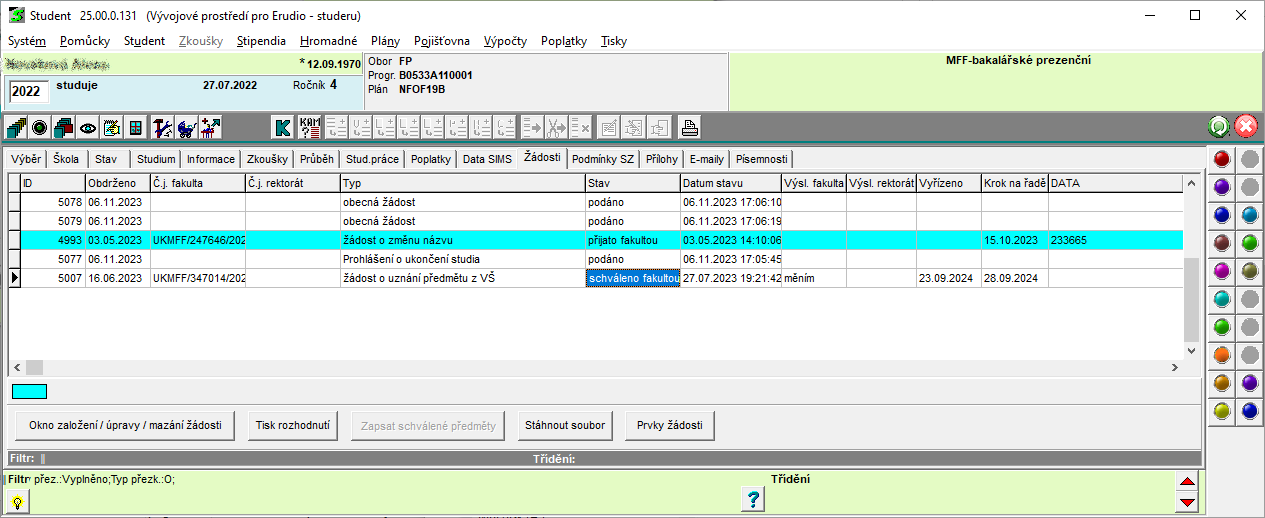 Student » ÚDAJE O STUDIU » Stránka Žádosti