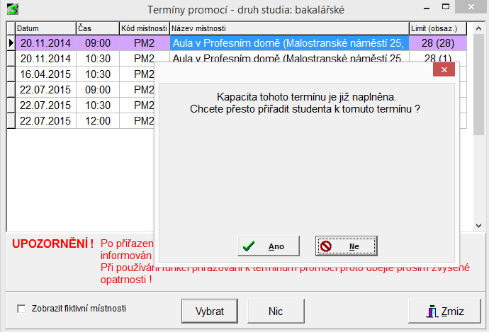 Pokud se přiřazuje termín promoce jednotlivě, ve výběru termínů se nabízí také termíny, které nemusí splňovat limity obsazenosti tj. termíny, na které lze přiřazovat i v případě, že jsou již podle kapacity plně obsazené. Tyto termíny jsou podbarvené fialovou barvou. Před přiřazením takovéhoto termínu, je-li už jeho kapacita naplněna, program oznámí, že se jedná o naplněný termín a zeptá se uživatele, zda má termín opravdu přiřadit. Pokud ano, termín se přiřadí. Pokud ne, k přiřazení nedojde a uživatel může vybrat jiný termín.