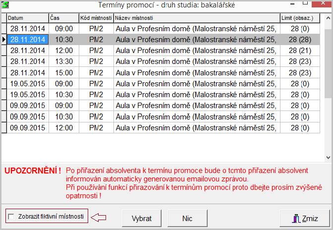 - Při přiřazování termínu promoce lze zaškrtávátkem "Zobrazit fiktivní místnosti" zobrazit seznam fiktivních místností.