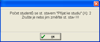 - Před provedením kontroly, program zjistí, zda neexistuje ještě nějaký student s dočasným studijní stavem X = přijat ke studiu. Pokud ano, zobrazí se hlášení: